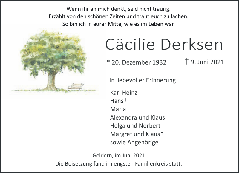 Hier finden Sie alle Traueranzeigen aus der Zeitung, die bisher für Cäcilie Derksen erschienen sind. Weitere Traueranzeigen, die in der Zeitung erscheinen, werden hier ebenfalls aufgelistet