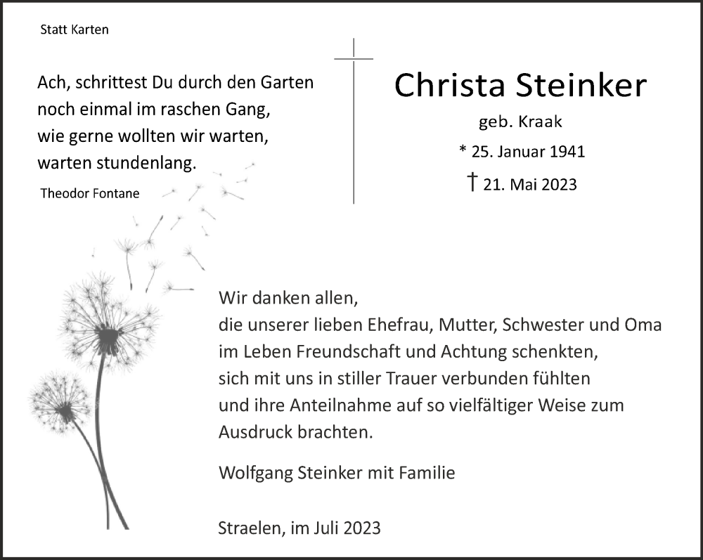 Hier finden Sie alle Traueranzeigen aus der Zeitung, die bisher für Christa Steinker erschienen sind. Weitere Traueranzeigen, die in der Zeitung erscheinen, werden hier ebenfalls aufgelistet