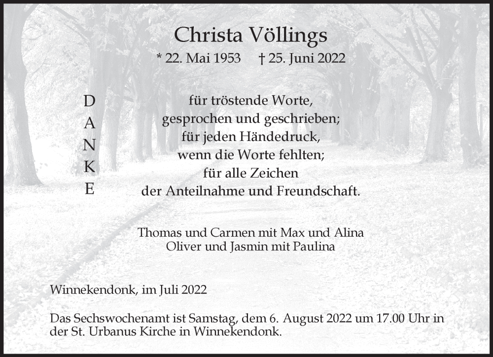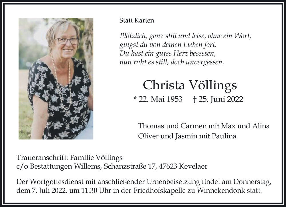 Hier finden Sie alle Traueranzeigen aus der Zeitung, die bisher für Christa Völlings erschienen sind. Weitere Traueranzeigen, die in der Zeitung erscheinen, werden hier ebenfalls aufgelistet
