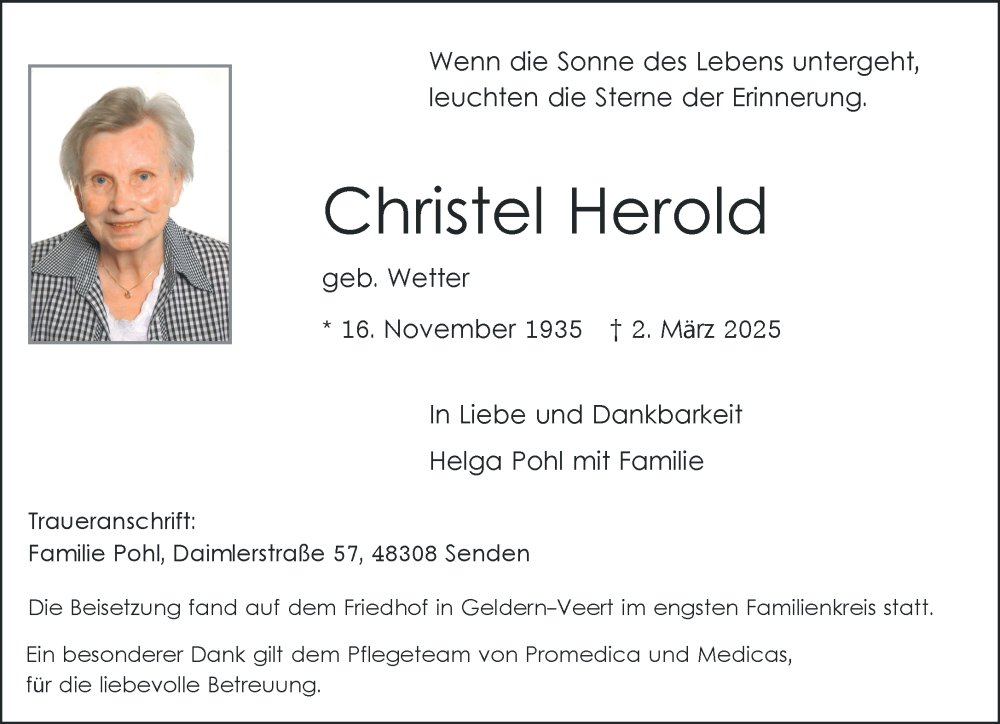 Hier finden Sie alle Traueranzeigen aus der Zeitung, die bisher für Christel Herold erschienen sind. Weitere Traueranzeigen, die in der Zeitung erscheinen, werden hier ebenfalls aufgelistet
