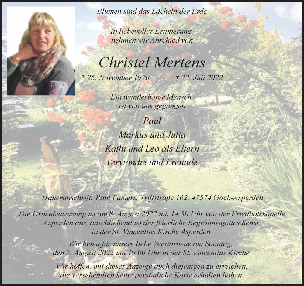 Hier finden Sie alle Traueranzeigen aus der Zeitung, die bisher für Christel Mertens erschienen sind. Weitere Traueranzeigen, die in der Zeitung erscheinen, werden hier ebenfalls aufgelistet