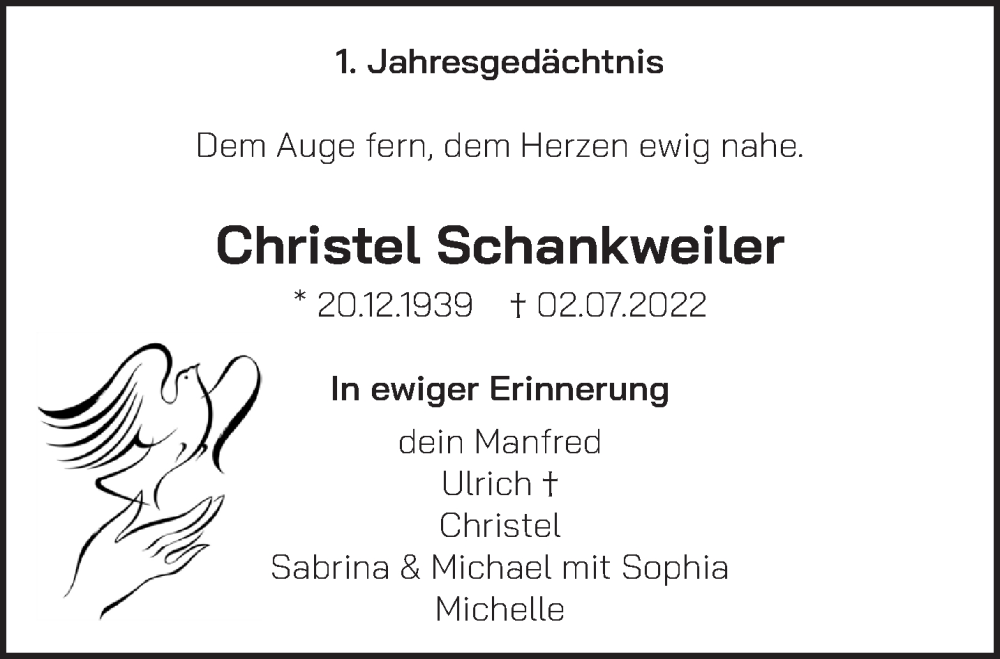 Hier finden Sie alle Traueranzeigen aus der Zeitung, die bisher für Christel Schankweiler erschienen sind. Weitere Traueranzeigen, die in der Zeitung erscheinen, werden hier ebenfalls aufgelistet