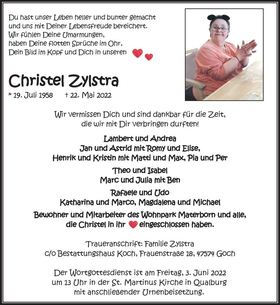Hier finden Sie alle Traueranzeigen aus der Zeitung, die bisher für Christel Zylstra erschienen sind. Weitere Traueranzeigen, die in der Zeitung erscheinen, werden hier ebenfalls aufgelistet
