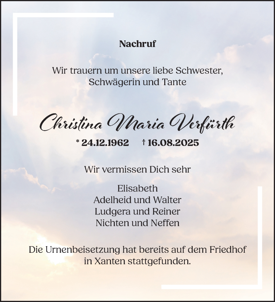Hier finden Sie alle Traueranzeigen aus der Zeitung, die bisher für Christina Maria Verfürth erschienen sind. Weitere Traueranzeigen, die in der Zeitung erscheinen, werden hier ebenfalls aufgelistet