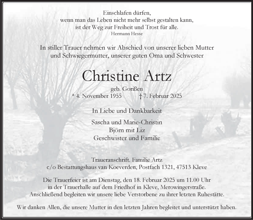 Hier finden Sie alle Traueranzeigen aus der Zeitung, die bisher für Christine Artz erschienen sind. Weitere Traueranzeigen, die in der Zeitung erscheinen, werden hier ebenfalls aufgelistet