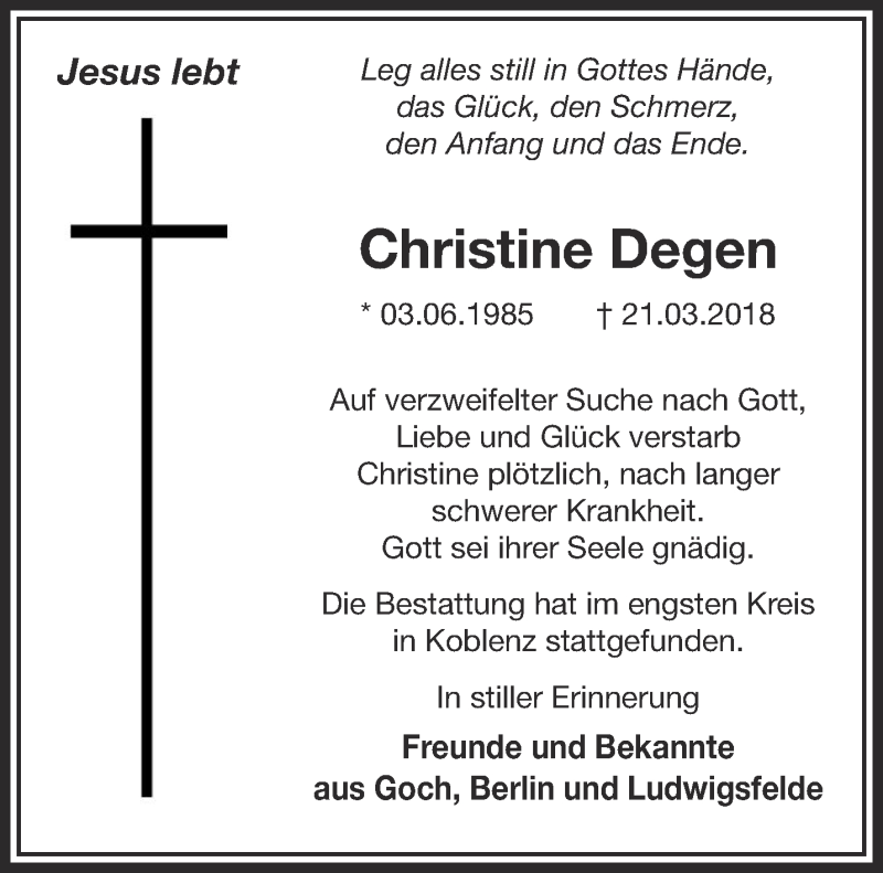 Hier finden Sie alle Traueranzeigen aus der Zeitung, die bisher für Christine Degen erschienen sind. Weitere Traueranzeigen, die in der Zeitung erscheinen, werden hier ebenfalls aufgelistet