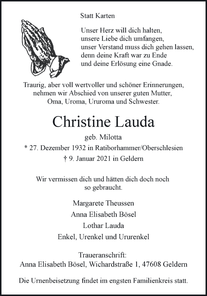 Hier finden Sie alle Traueranzeigen aus der Zeitung, die bisher für Christine Lauda erschienen sind. Weitere Traueranzeigen, die in der Zeitung erscheinen, werden hier ebenfalls aufgelistet