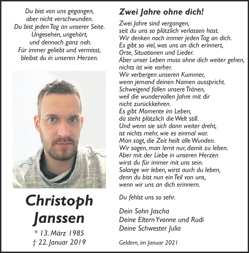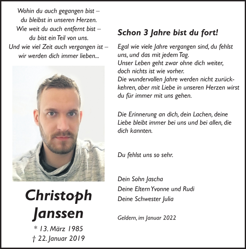 Hier finden Sie alle Traueranzeigen aus der Zeitung, die bisher für Christoph Janssen erschienen sind. Weitere Traueranzeigen, die in der Zeitung erscheinen, werden hier ebenfalls aufgelistet
