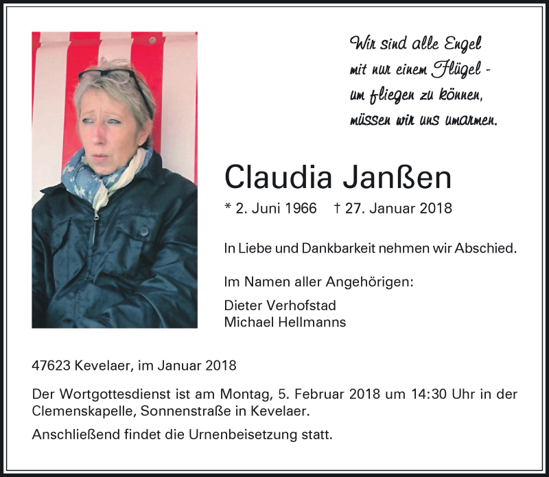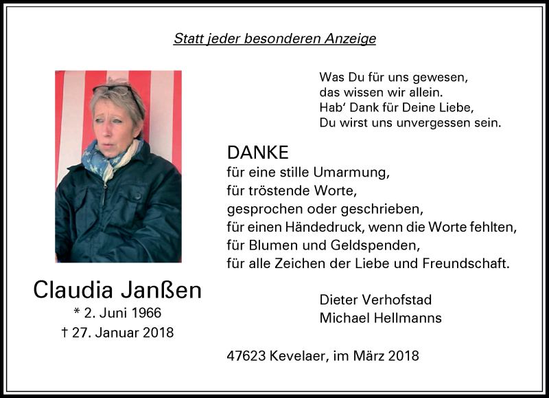 Hier finden Sie alle Traueranzeigen aus der Zeitung, die bisher für Claudia Janßen erschienen sind. Weitere Traueranzeigen, die in der Zeitung erscheinen, werden hier ebenfalls aufgelistet