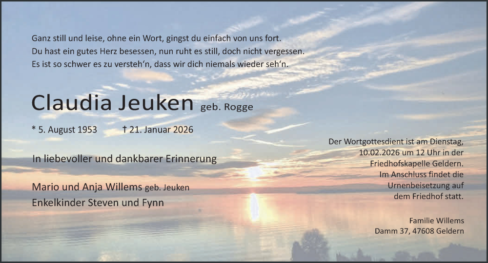 Hier finden Sie alle Traueranzeigen aus der Zeitung, die bisher für Claudia Jeuken erschienen sind. Weitere Traueranzeigen, die in der Zeitung erscheinen, werden hier ebenfalls aufgelistet