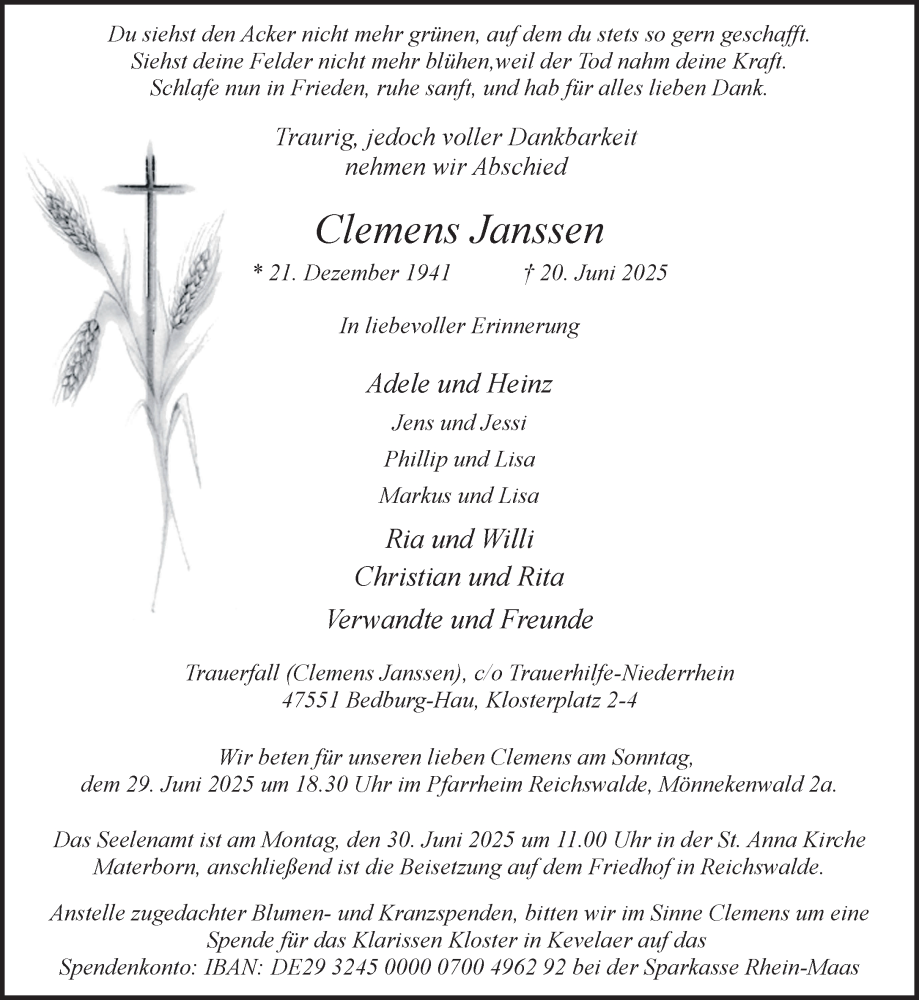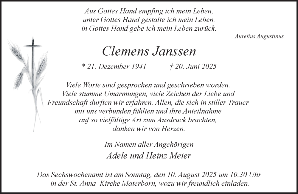 Hier finden Sie alle Traueranzeigen aus der Zeitung, die bisher für Clemens Janssen erschienen sind. Weitere Traueranzeigen, die in der Zeitung erscheinen, werden hier ebenfalls aufgelistet