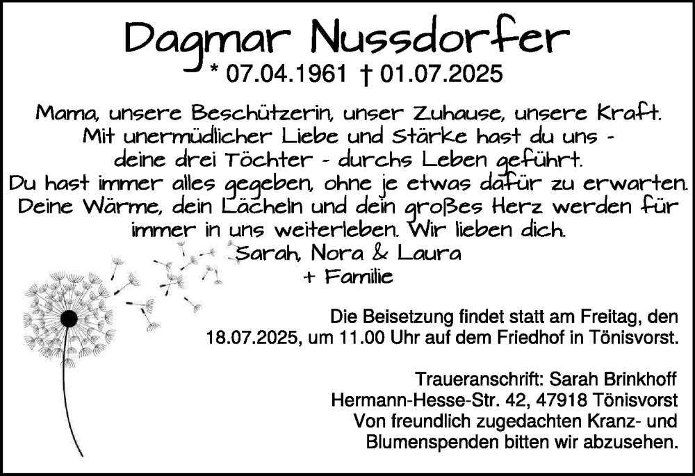 Hier finden Sie alle Traueranzeigen aus der Zeitung, die bisher für Dagmar Nußdorfer erschienen sind. Weitere Traueranzeigen, die in der Zeitung erscheinen, werden hier ebenfalls aufgelistet