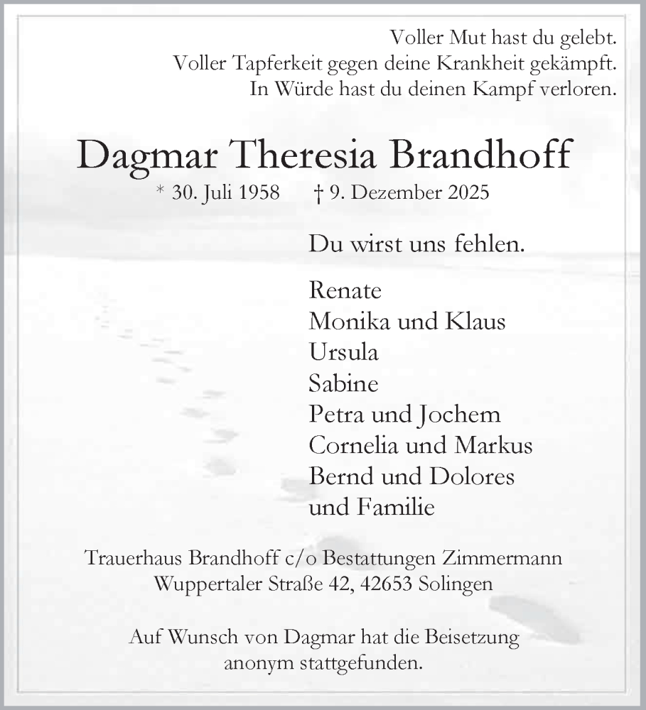 Hier finden Sie alle Traueranzeigen aus der Zeitung, die bisher für Dagmar Theresia Brandhoff erschienen sind. Weitere Traueranzeigen, die in der Zeitung erscheinen, werden hier ebenfalls aufgelistet