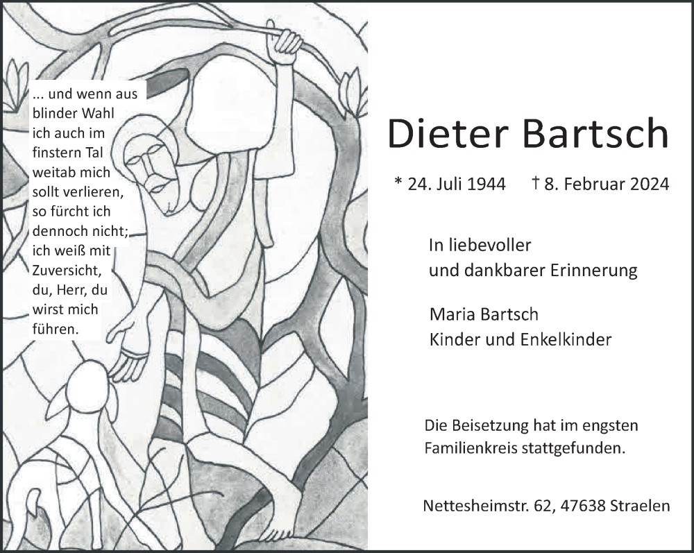 Hier finden Sie alle Traueranzeigen aus der Zeitung, die bisher für Dieter Bartsch erschienen sind. Weitere Traueranzeigen, die in der Zeitung erscheinen, werden hier ebenfalls aufgelistet