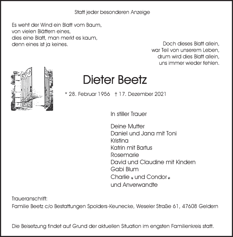 Hier finden Sie alle Traueranzeigen aus der Zeitung, die bisher für Dieter Beetz erschienen sind. Weitere Traueranzeigen, die in der Zeitung erscheinen, werden hier ebenfalls aufgelistet