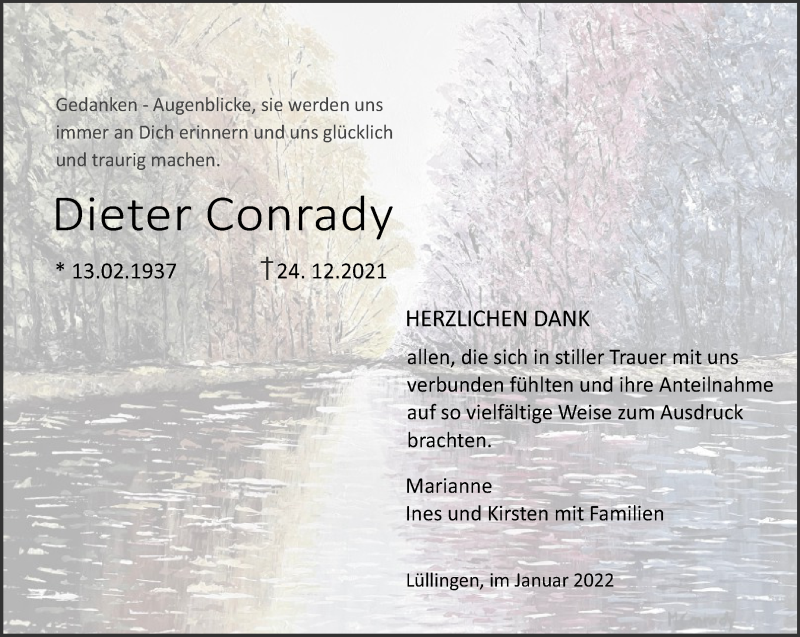 Hier finden Sie alle Traueranzeigen aus der Zeitung, die bisher für Dieter Conrady erschienen sind. Weitere Traueranzeigen, die in der Zeitung erscheinen, werden hier ebenfalls aufgelistet