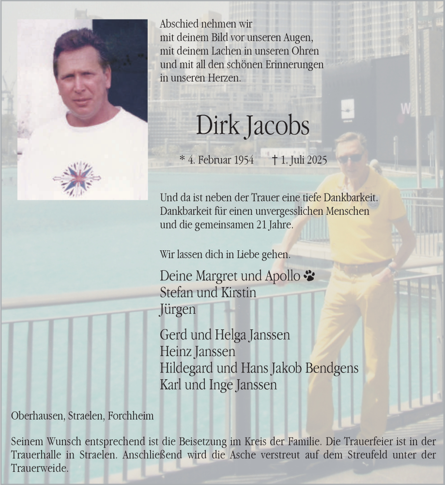 Hier finden Sie alle Traueranzeigen aus der Zeitung, die bisher für Dirk Jacobs erschienen sind. Weitere Traueranzeigen, die in der Zeitung erscheinen, werden hier ebenfalls aufgelistet