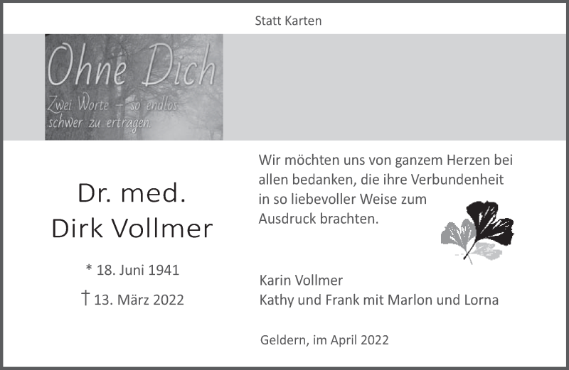 Hier finden Sie alle Traueranzeigen aus der Zeitung, die bisher für Dirk Vollmer erschienen sind. Weitere Traueranzeigen, die in der Zeitung erscheinen, werden hier ebenfalls aufgelistet