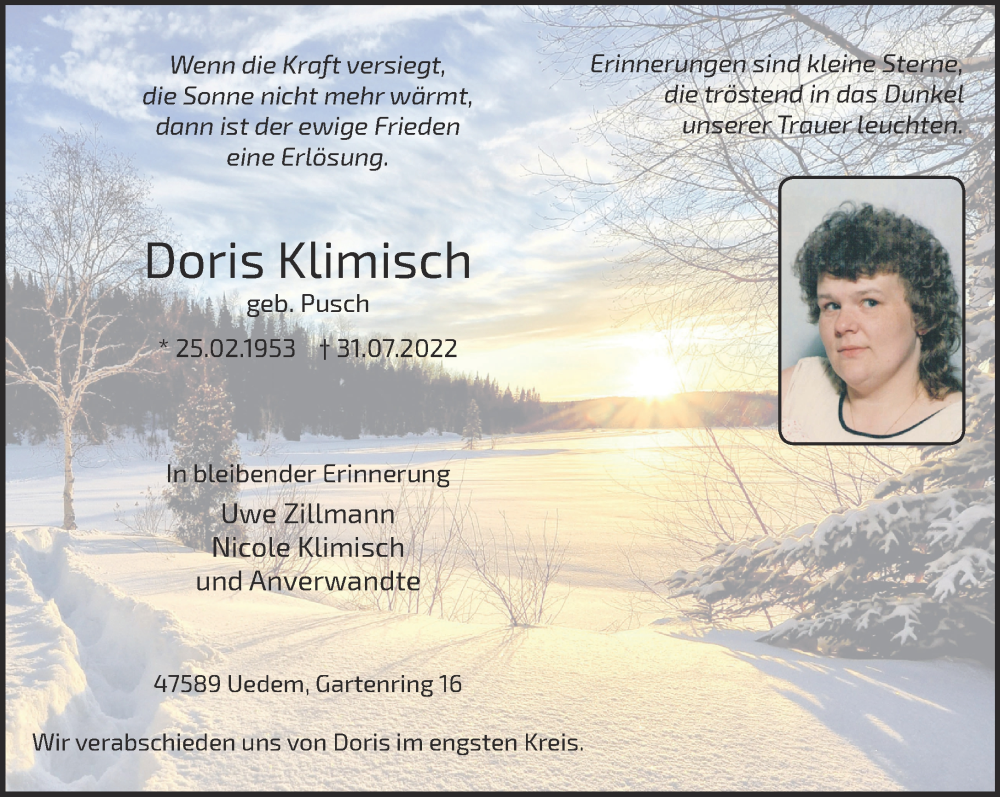 Hier finden Sie alle Traueranzeigen aus der Zeitung, die bisher für Doris Klimisch erschienen sind. Weitere Traueranzeigen, die in der Zeitung erscheinen, werden hier ebenfalls aufgelistet