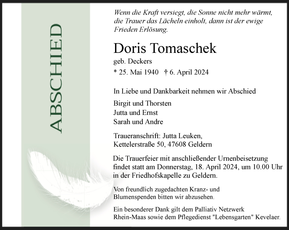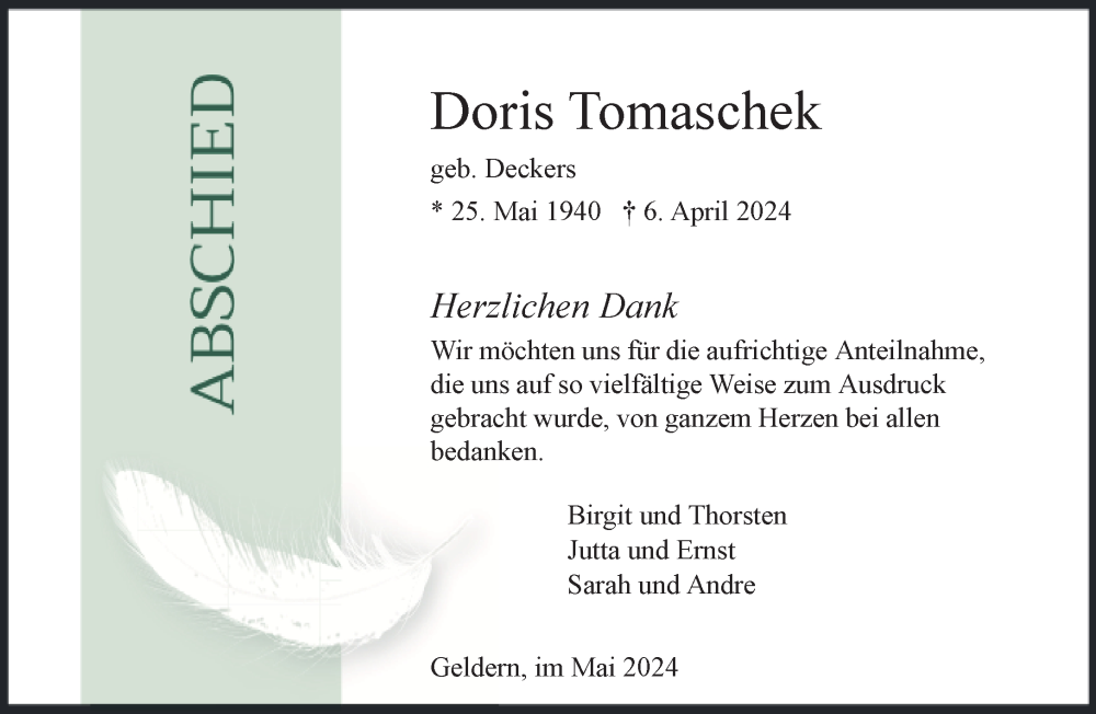 Hier finden Sie alle Traueranzeigen aus der Zeitung, die bisher für Doris Tomaschek erschienen sind. Weitere Traueranzeigen, die in der Zeitung erscheinen, werden hier ebenfalls aufgelistet