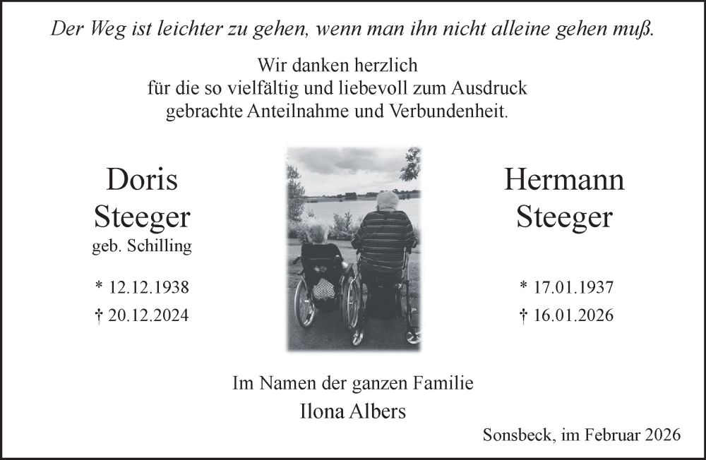 Hier finden Sie alle Traueranzeigen aus der Zeitung, die bisher für Doris und Hermann Steeger erschienen sind. Weitere Traueranzeigen, die in der Zeitung erscheinen, werden hier ebenfalls aufgelistet