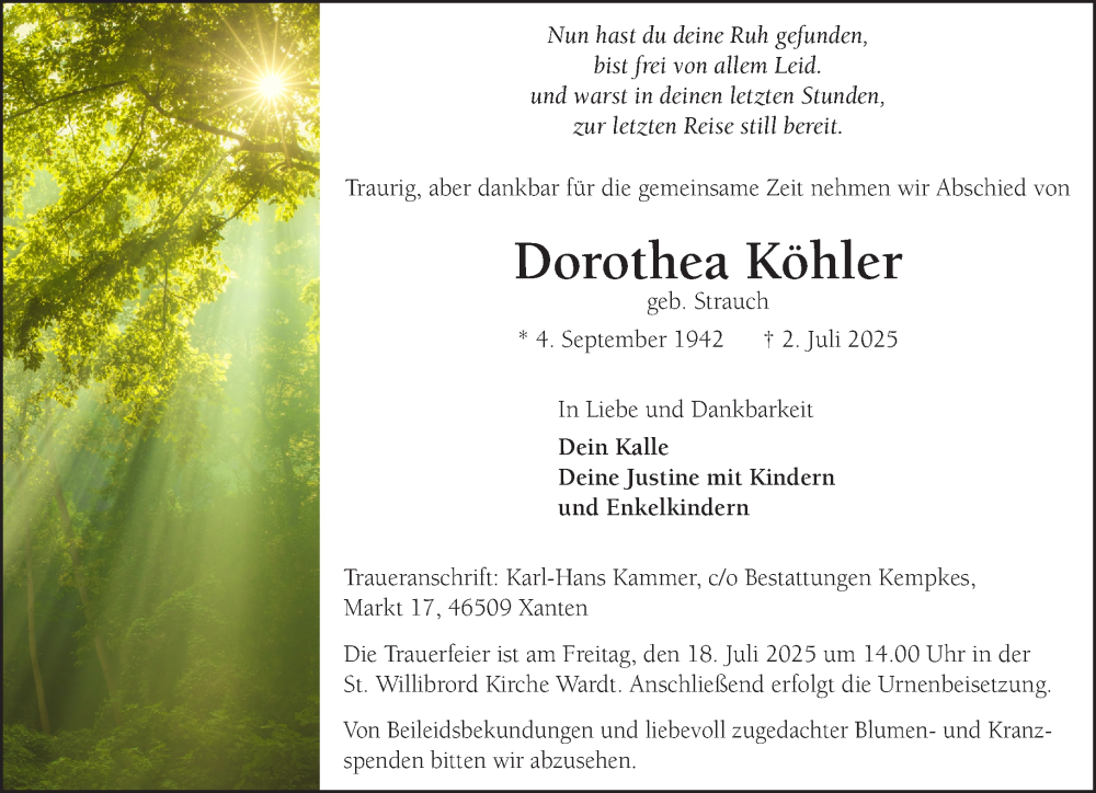 Hier finden Sie alle Traueranzeigen aus der Zeitung, die bisher für Dorothea Köhler erschienen sind. Weitere Traueranzeigen, die in der Zeitung erscheinen, werden hier ebenfalls aufgelistet
