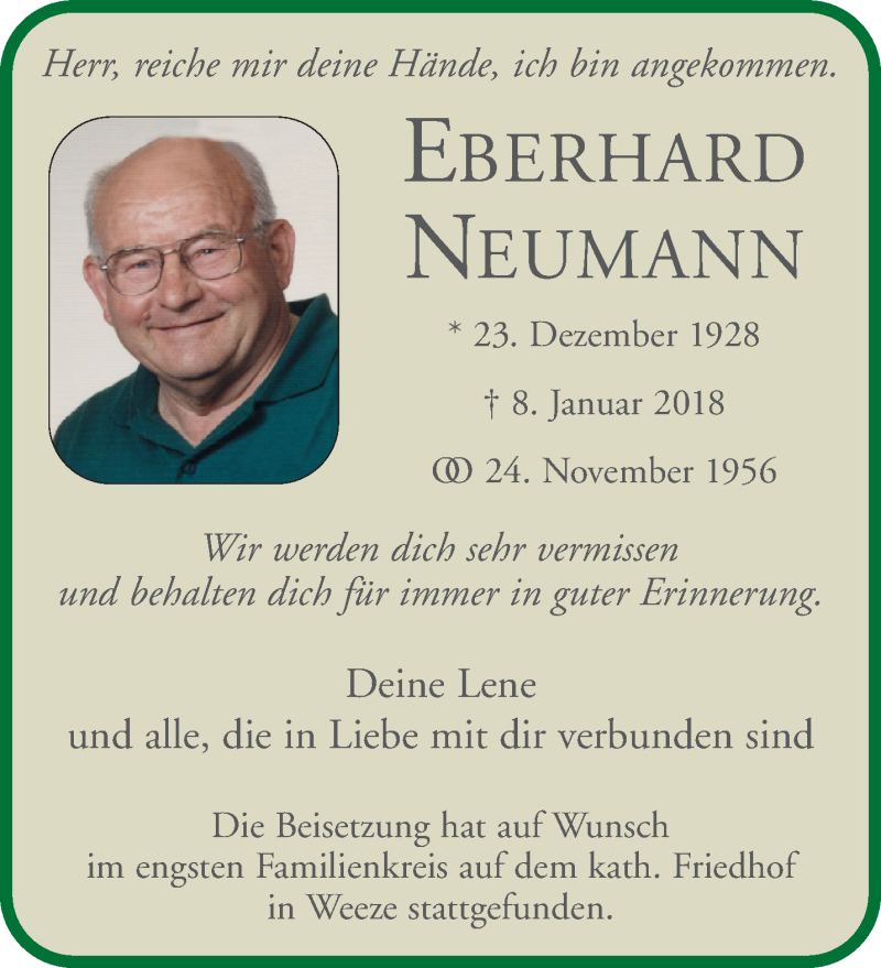 Hier finden Sie alle Traueranzeigen aus der Zeitung, die bisher für Eberhard Neumann erschienen sind. Weitere Traueranzeigen, die in der Zeitung erscheinen, werden hier ebenfalls aufgelistet