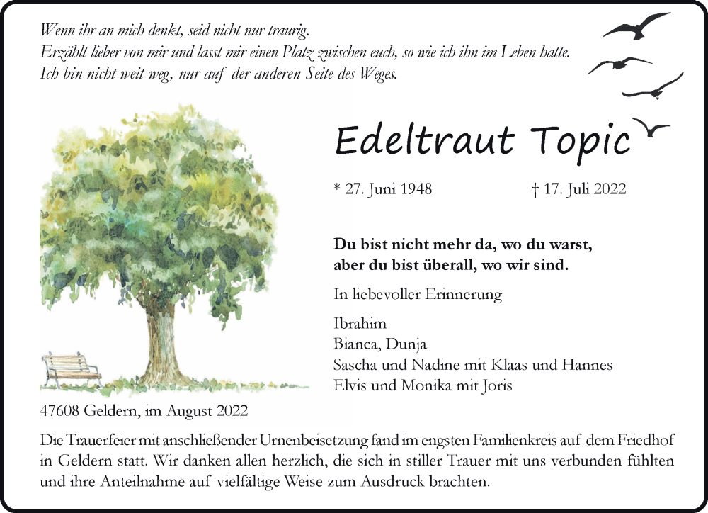 Hier finden Sie alle Traueranzeigen aus der Zeitung, die bisher für Edeltraut Topic erschienen sind. Weitere Traueranzeigen, die in der Zeitung erscheinen, werden hier ebenfalls aufgelistet