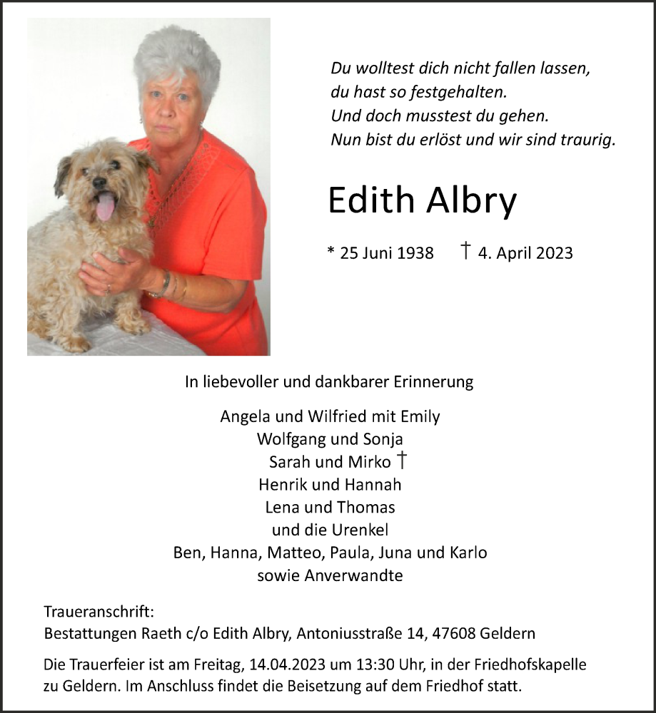 Hier finden Sie alle Traueranzeigen aus der Zeitung, die bisher für Edith Albry erschienen sind. Weitere Traueranzeigen, die in der Zeitung erscheinen, werden hier ebenfalls aufgelistet