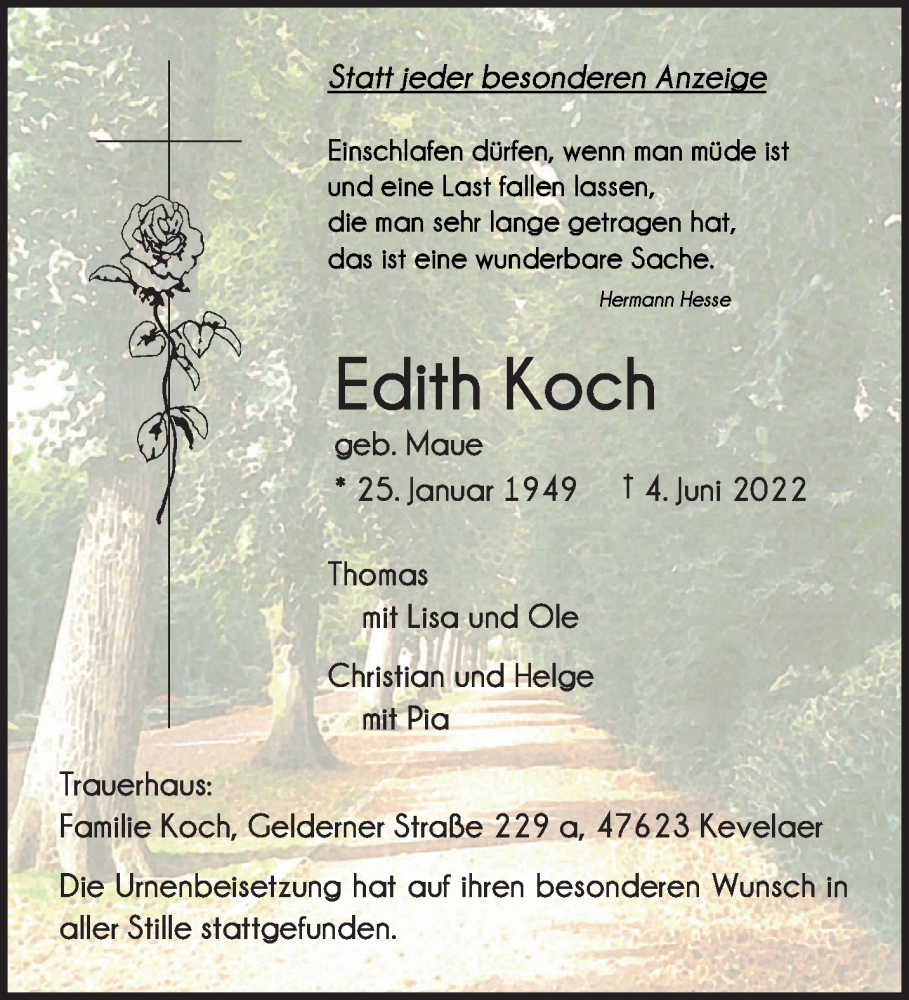 Hier finden Sie alle Traueranzeigen aus der Zeitung, die bisher für Edith Koch erschienen sind. Weitere Traueranzeigen, die in der Zeitung erscheinen, werden hier ebenfalls aufgelistet