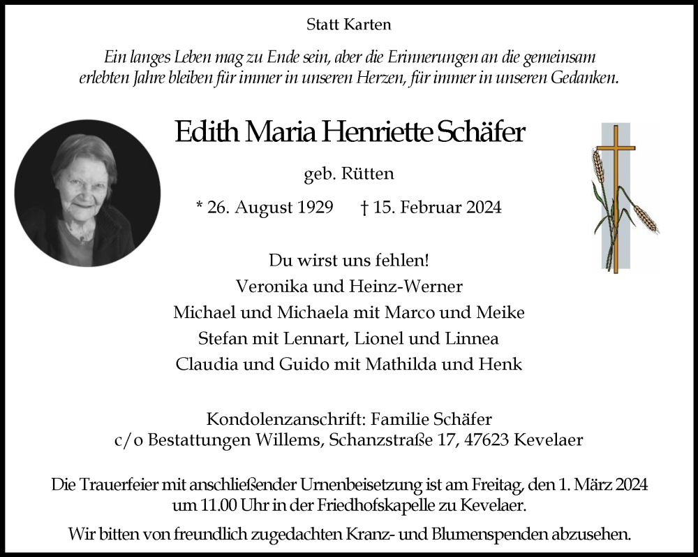 Hier finden Sie alle Traueranzeigen aus der Zeitung, die bisher für Edith Schäfer erschienen sind. Weitere Traueranzeigen, die in der Zeitung erscheinen, werden hier ebenfalls aufgelistet