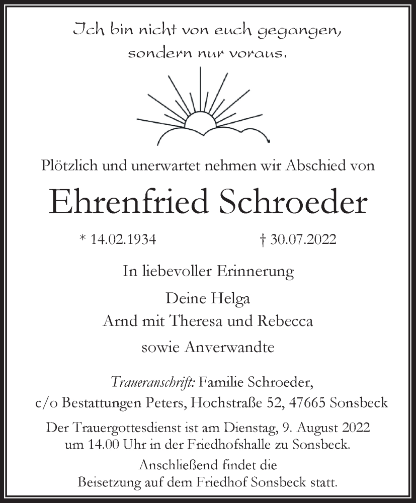 Hier finden Sie alle Traueranzeigen aus der Zeitung, die bisher für Ehrenfried Schroeder erschienen sind. Weitere Traueranzeigen, die in der Zeitung erscheinen, werden hier ebenfalls aufgelistet