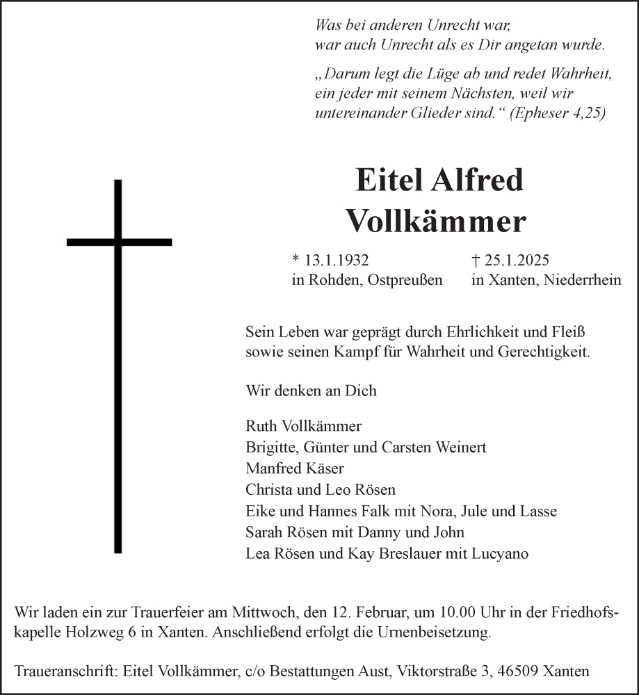 Hier finden Sie alle Traueranzeigen aus der Zeitung, die bisher für Eitel Alfred Vollkämmer erschienen sind. Weitere Traueranzeigen, die in der Zeitung erscheinen, werden hier ebenfalls aufgelistet