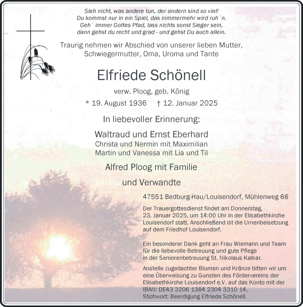 Hier finden Sie alle Traueranzeigen aus der Zeitung, die bisher für Elfriede Schönell erschienen sind. Weitere Traueranzeigen, die in der Zeitung erscheinen, werden hier ebenfalls aufgelistet