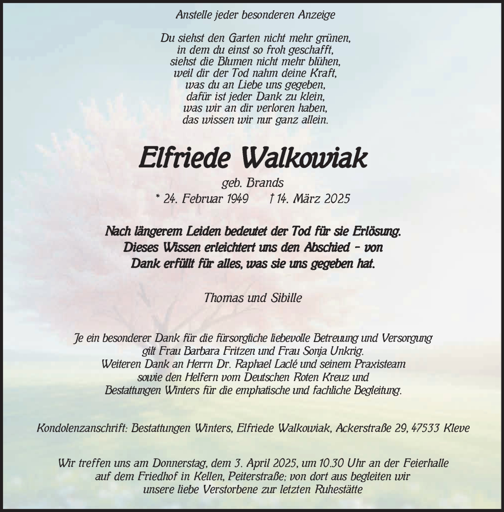 Hier finden Sie alle Traueranzeigen aus der Zeitung, die bisher für Elfriede Walkowiak erschienen sind. Weitere Traueranzeigen, die in der Zeitung erscheinen, werden hier ebenfalls aufgelistet