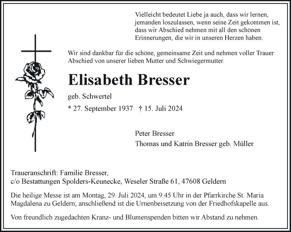 Hier finden Sie alle Traueranzeigen aus der Zeitung, die bisher für Elisabeth Bresser erschienen sind. Weitere Traueranzeigen, die in der Zeitung erscheinen, werden hier ebenfalls aufgelistet