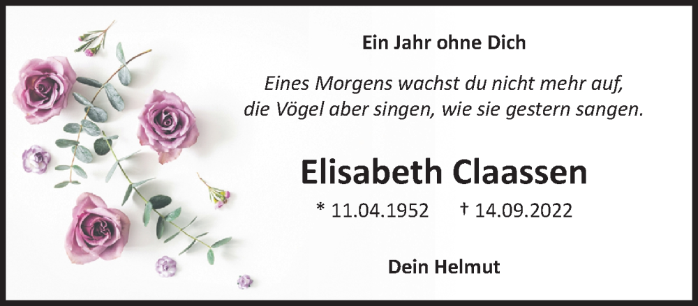 Hier finden Sie alle Traueranzeigen aus der Zeitung, die bisher für Elisabeth Claassen erschienen sind. Weitere Traueranzeigen, die in der Zeitung erscheinen, werden hier ebenfalls aufgelistet