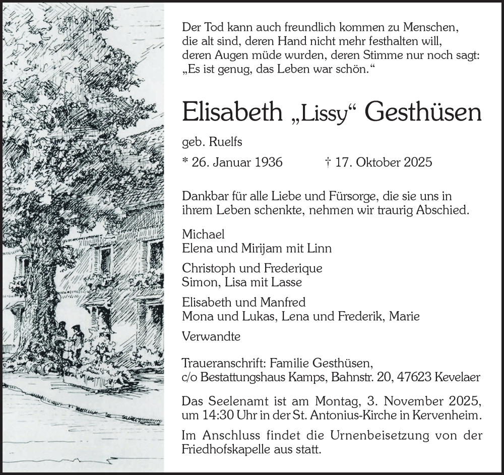 Hier finden Sie alle Traueranzeigen aus der Zeitung, die bisher für Elisabeth Gesthüsen erschienen sind. Weitere Traueranzeigen, die in der Zeitung erscheinen, werden hier ebenfalls aufgelistet