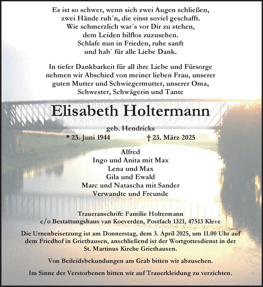 Hier finden Sie alle Traueranzeigen aus der Zeitung, die bisher für Elisabeth Holtermann erschienen sind. Weitere Traueranzeigen, die in der Zeitung erscheinen, werden hier ebenfalls aufgelistet