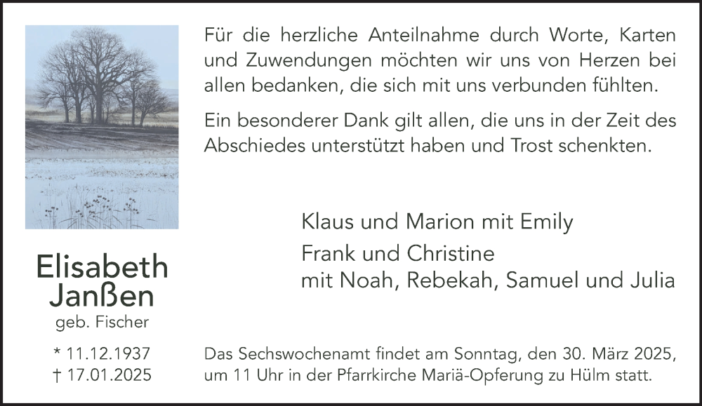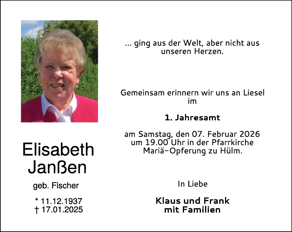 Hier finden Sie alle Traueranzeigen aus der Zeitung, die bisher für Elisabeth Janßen erschienen sind. Weitere Traueranzeigen, die in der Zeitung erscheinen, werden hier ebenfalls aufgelistet