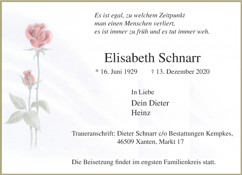 Hier finden Sie alle Traueranzeigen aus der Zeitung, die bisher für Elisabeth Schnarr erschienen sind. Weitere Traueranzeigen, die in der Zeitung erscheinen, werden hier ebenfalls aufgelistet