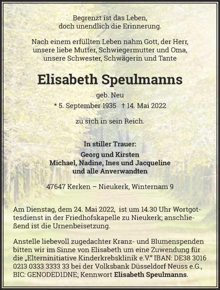 Hier finden Sie alle Traueranzeigen aus der Zeitung, die bisher für Elisabeth Speulmanns erschienen sind. Weitere Traueranzeigen, die in der Zeitung erscheinen, werden hier ebenfalls aufgelistet