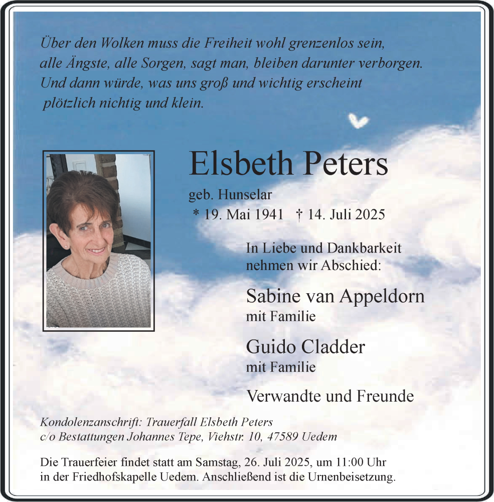 Hier finden Sie alle Traueranzeigen aus der Zeitung, die bisher für Elsbeth Peters erschienen sind. Weitere Traueranzeigen, die in der Zeitung erscheinen, werden hier ebenfalls aufgelistet