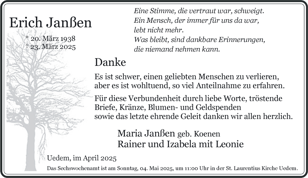 Hier finden Sie alle Traueranzeigen aus der Zeitung, die bisher für Erich Janßen erschienen sind. Weitere Traueranzeigen, die in der Zeitung erscheinen, werden hier ebenfalls aufgelistet