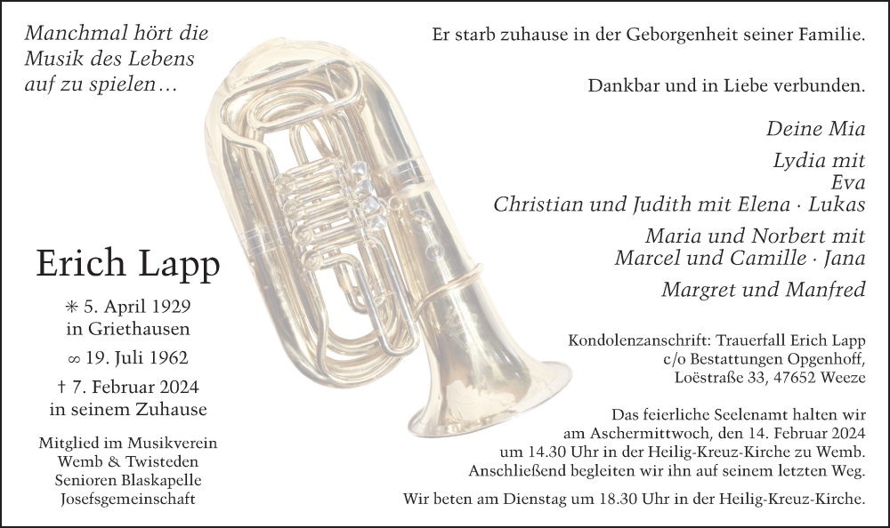 Hier finden Sie alle Traueranzeigen aus der Zeitung, die bisher für Erich Lapp erschienen sind. Weitere Traueranzeigen, die in der Zeitung erscheinen, werden hier ebenfalls aufgelistet
