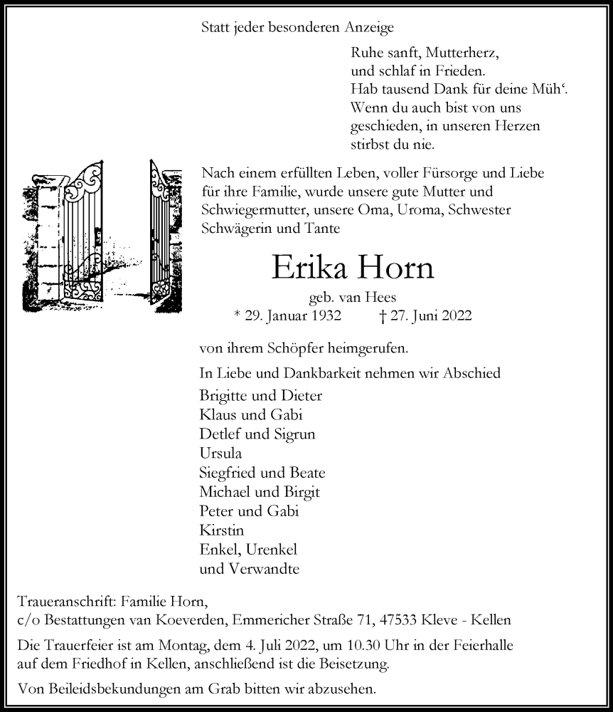 Hier finden Sie alle Traueranzeigen aus der Zeitung, die bisher für Erika Horn erschienen sind. Weitere Traueranzeigen, die in der Zeitung erscheinen, werden hier ebenfalls aufgelistet