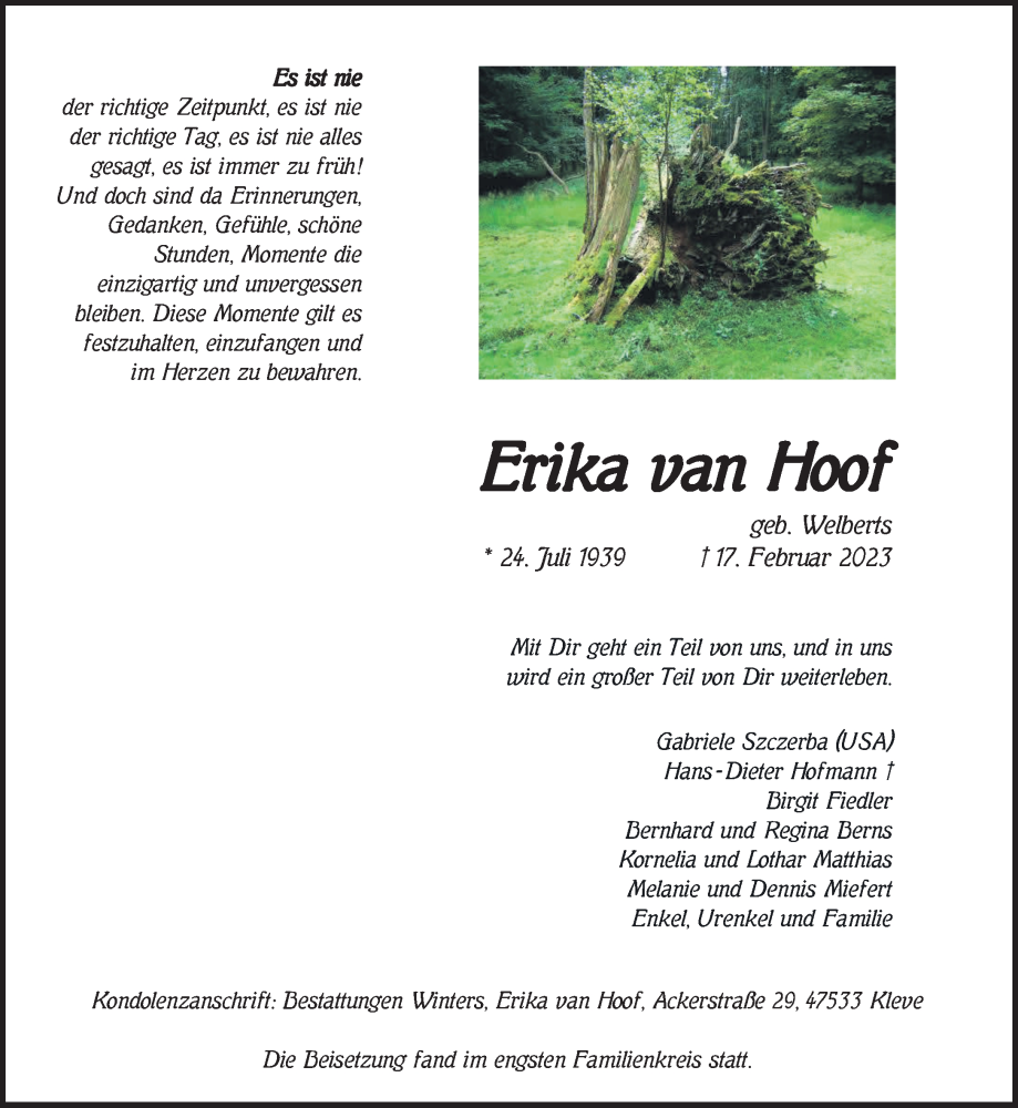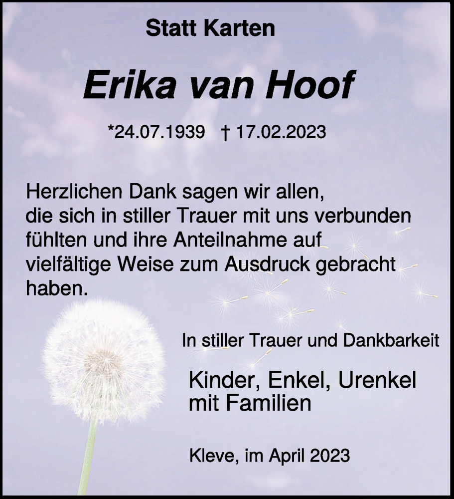 Hier finden Sie alle Traueranzeigen aus der Zeitung, die bisher für Erika van Hoof erschienen sind. Weitere Traueranzeigen, die in der Zeitung erscheinen, werden hier ebenfalls aufgelistet