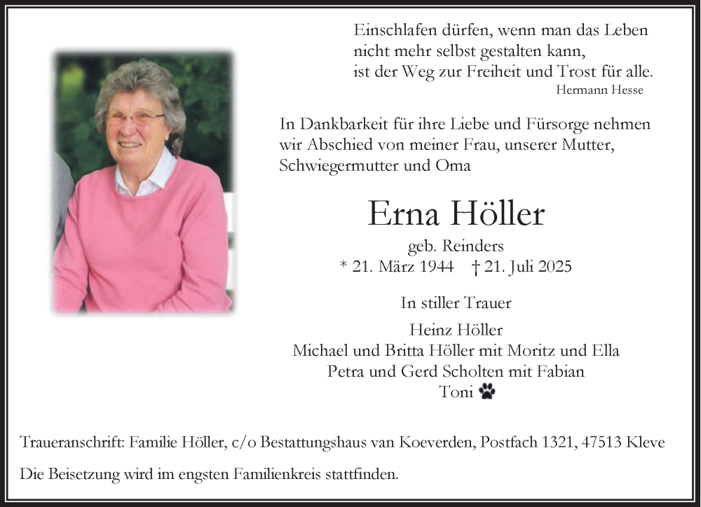 Hier finden Sie alle Traueranzeigen aus der Zeitung, die bisher für Erna Höller erschienen sind. Weitere Traueranzeigen, die in der Zeitung erscheinen, werden hier ebenfalls aufgelistet