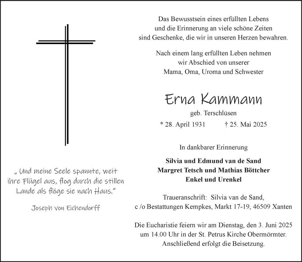 Hier finden Sie alle Traueranzeigen aus der Zeitung, die bisher für Erna Kammann erschienen sind. Weitere Traueranzeigen, die in der Zeitung erscheinen, werden hier ebenfalls aufgelistet