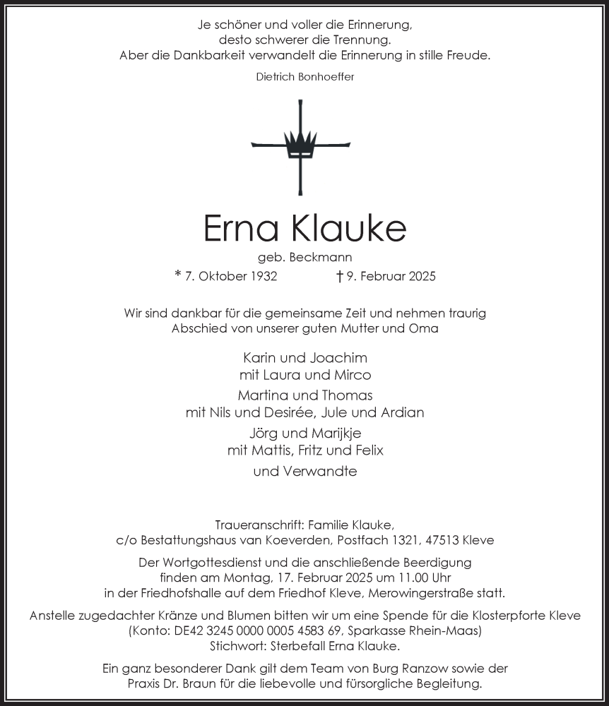 Hier finden Sie alle Traueranzeigen aus der Zeitung, die bisher für Erna Klauke erschienen sind. Weitere Traueranzeigen, die in der Zeitung erscheinen, werden hier ebenfalls aufgelistet